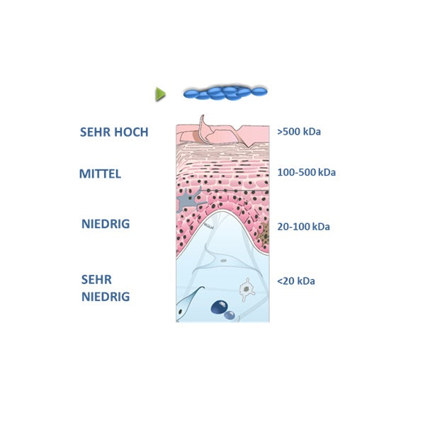 Hyaluronsäure aus 4 unterschiedlichen Molekulargewichten um die Haut in der Tiefe mit Feuchtigkeit zu versorgen und sie auch vor vorzeitigem Wasserverlust durch äußere aggressive Einflüsse zu schützen.