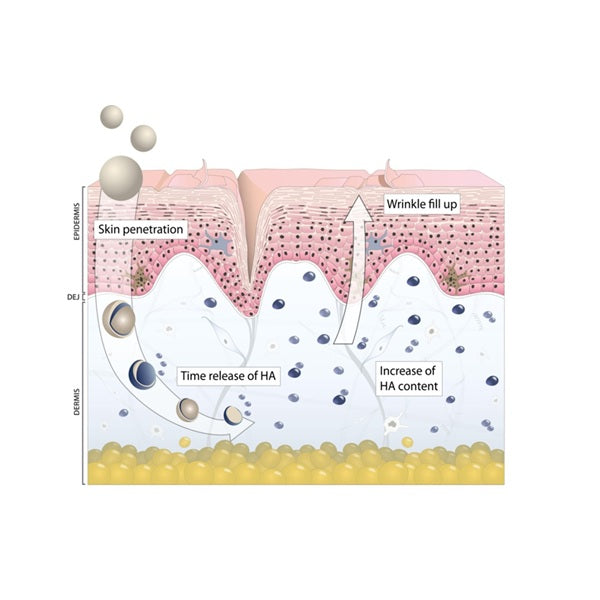 Dehydrierte Hyaluronsäure-Mikrokügelchen biotechnologischen Ursprungs. Bei Kontakt mit Wasser in der Haut speichert es Feuchtigkeit und vergrößert sich, sie erreichen bis zum 30-fachen ihrer normalen Größe aufgrund seines "Faltenfülleffekts" in der Epidermis.
