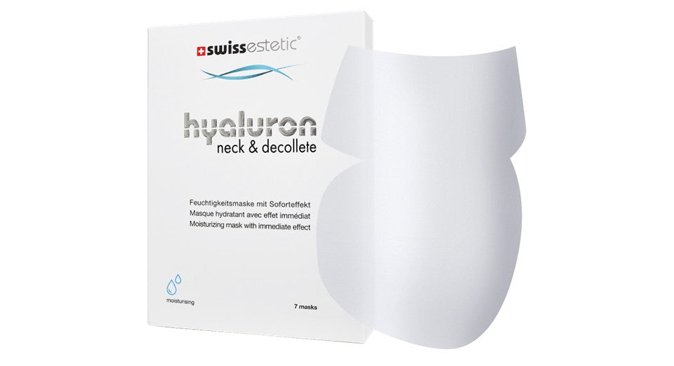 swissestetic®präsentiert die hyaluron neck & decollete mask, eine hochwertige Baumwollmaske, welche mit Hyaluronsäure, Irisch Moos und Matrixyl getränkt ist. Die Maske befeuchtet und beruhigt den Hals- und Dekolleté-Bereich.