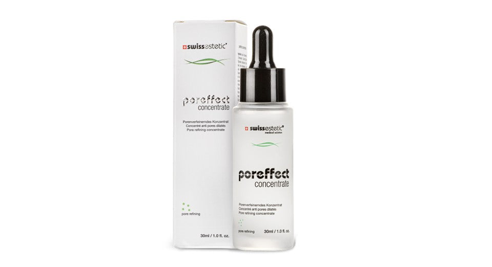 Ob gegen grosse Poren, eine übermässige Talgproduktion oder glänzende Haut im Gesicht – mit dem poreffect concentrate bietet swissestetic ein porenverfeinerndes Serum der neuen Generation, das durch den innovativen Wirkstoffkomplex nicht nur grossen Poren und fettiger Haut entgegenwirkt, sondern gleichzeitig auch einen starken Anti-Aging Effekt mitbringt.